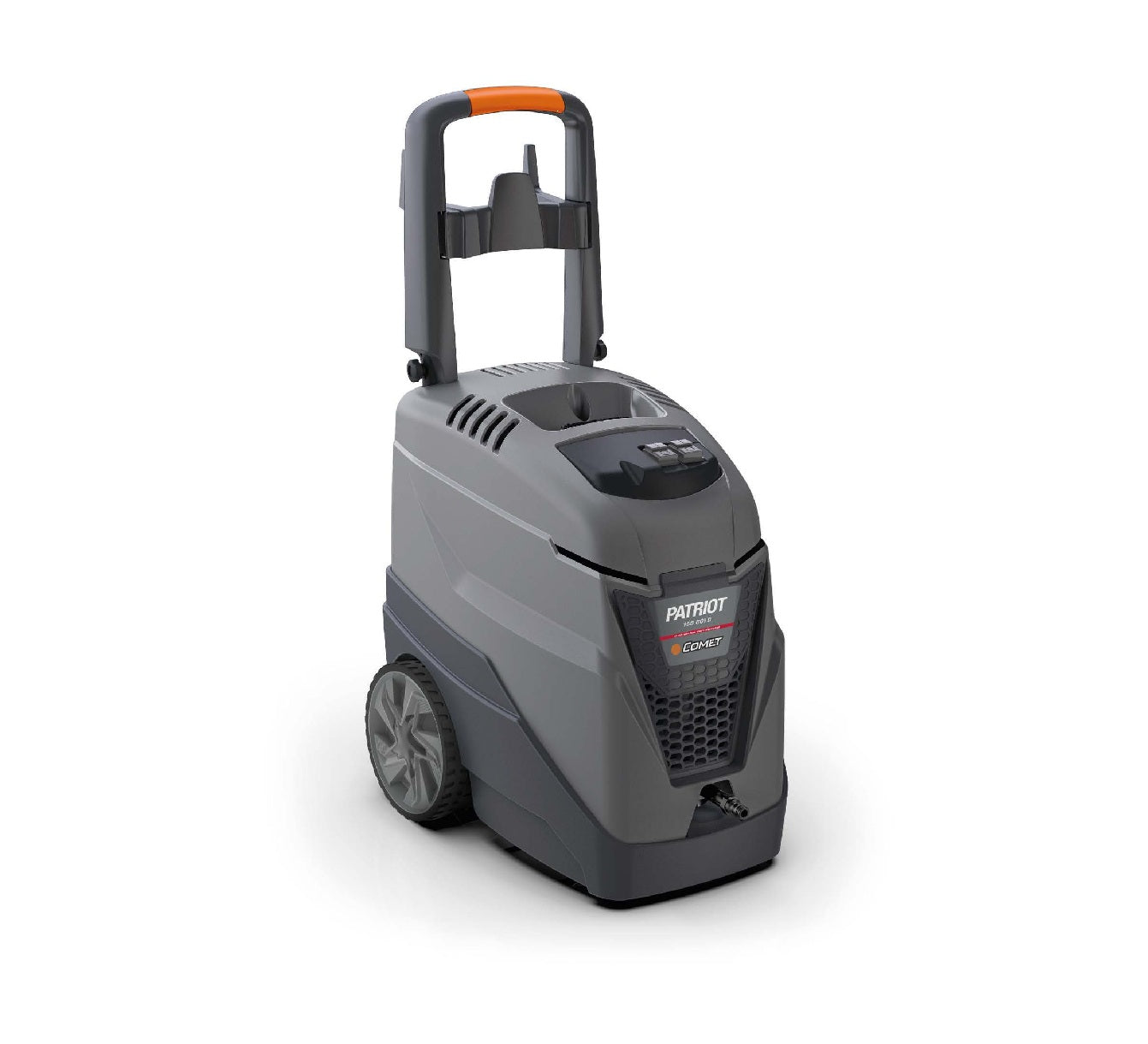 Elettropompa a tre pistoni assiali disposta in verticale con pompa in basso e costruzione interamente in metallo, senza materiale plastico nei componenti strutturali